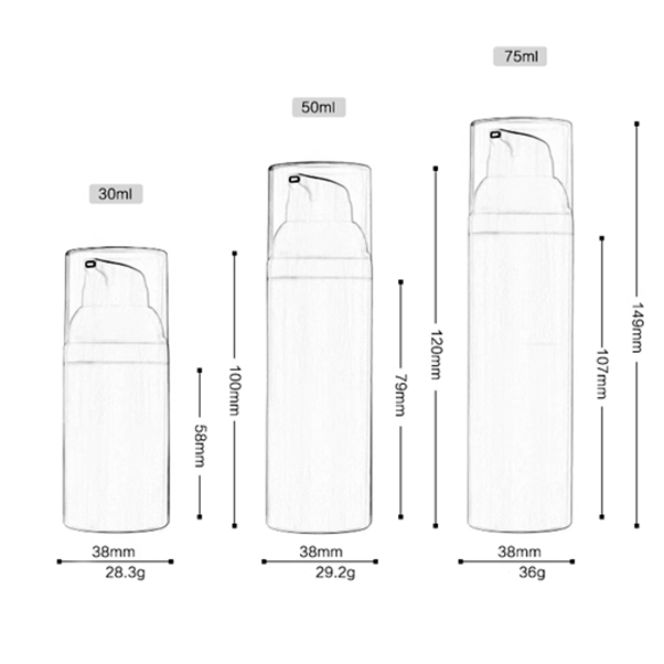 Вакуумний флакон (диспенсер) не має закрутки — помпа фіксується після повного наповнення ємності. Зверху диспенсер закривається прозорою захисною кришкою без різьби. Лаконічний дизайн та збільшена зона під етикетку роблять флакон ідеальним для брендування.
