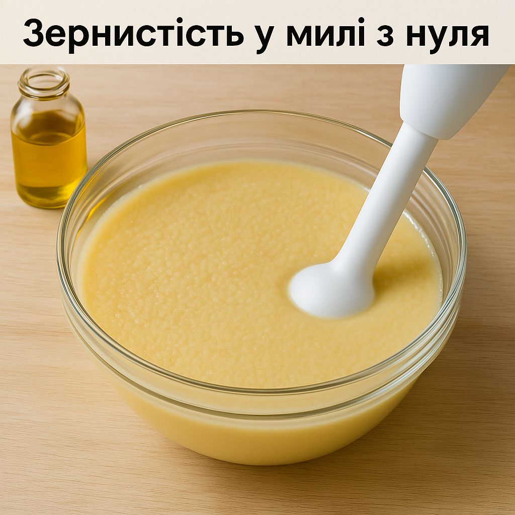 Це явище, при якому у мильній масі утворюються маленькі грудочки, схожі на зернятка рису. Це може трапитися, якщо ароматична олія не рівномірно змішується з мильною масою. Зазвичай це легко виправити додатковим змішуванням блендером або вручну лопаткою, але важливо стежити за консистенцією.